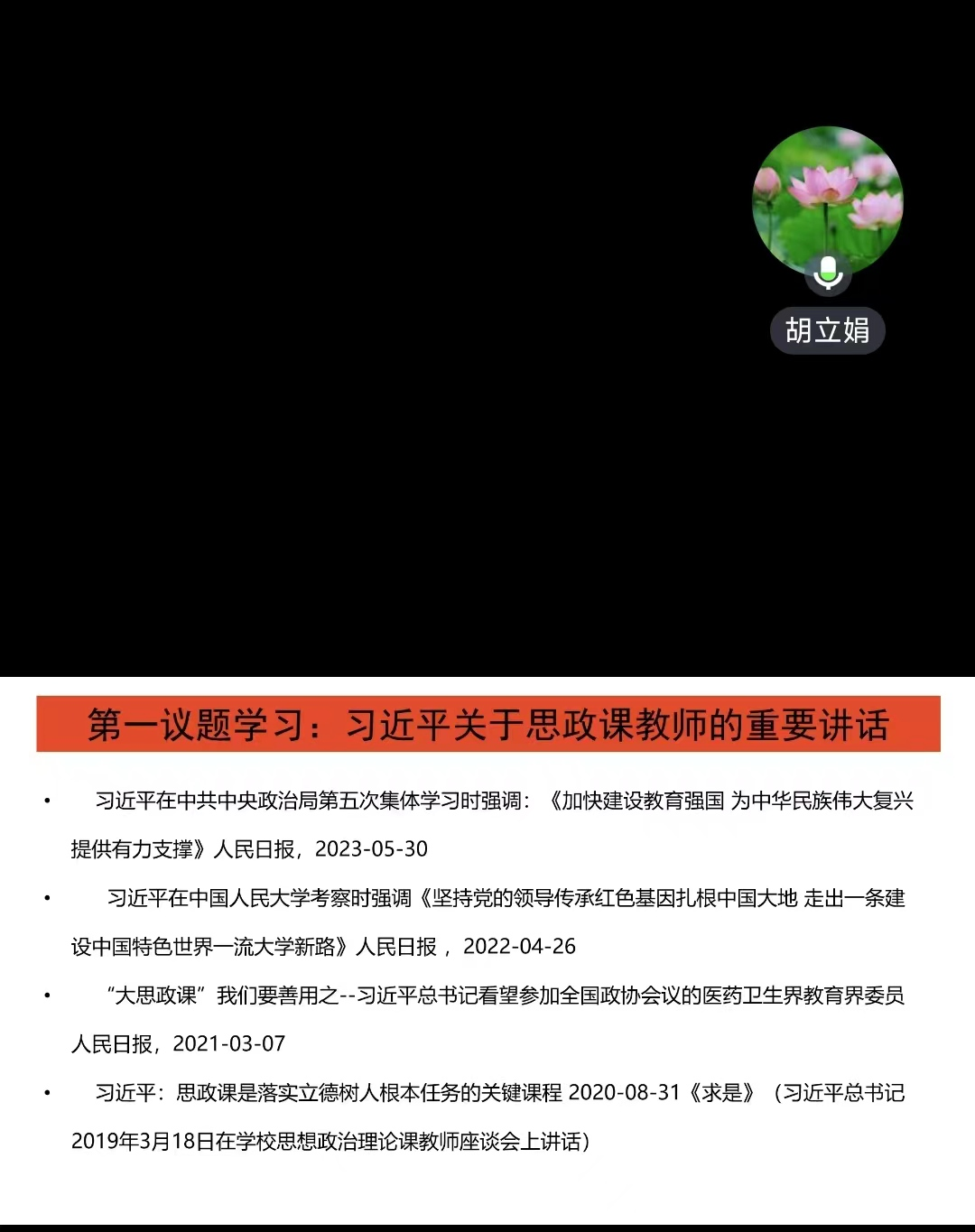 首先胡立娟院长助理带领大家学习了习近平总书记关于思政课教师的重要讲话精神,胡老师重点向大家介绍了习近平总书记对思政教师的“六要”要求,即政治要强、情怀要深、思维要新、视野要广、自律要严、人格要正,以及“八个统一”即坚持政治性和学理性相统一;价值性和知识性相统一;建设性和批判性相统一;理论性和实践性相统一;统一性和多样性相统一;主导性和主体性相统一;灌输性和启发性相统一;显性教育和隐性教育相统一。胡老师总结了师德教育活动月的相关工作,并且布置了期中教学检查及试卷归档的安排及要求。
