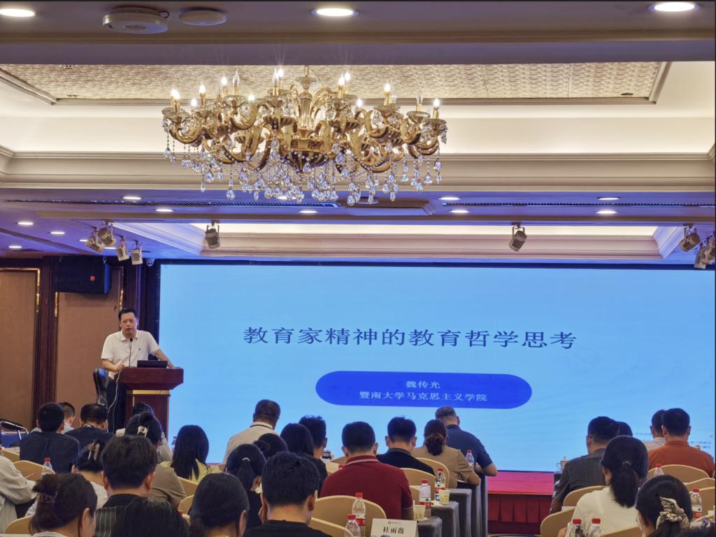在第二场专题培训中,暨南大学魏传光教授作了题为“教育家精神的教育哲学思考”的专题讲座。魏教授主要围绕以下五个部分展开论述:第一,魏教授阐述了教育家精神的由来和内涵。第二,魏教授围绕教育家精神内容展开了哲学思考,指出六大精神之间具有密切的逻辑联系,形成了教育家精神内容的整体价值。第三,魏教授强调教师是教育的中心,师的战略地位是立教之本,兴教之源,阐释了新时代教师队伍建设的成就、支撑和重点。第四,魏教授论述了教育家精神的重要性,提出教育家精神是中国传统师道文化的传承,具有其自身的独特性。第五,魏教授认为要用教育家精神引领教师发展。
