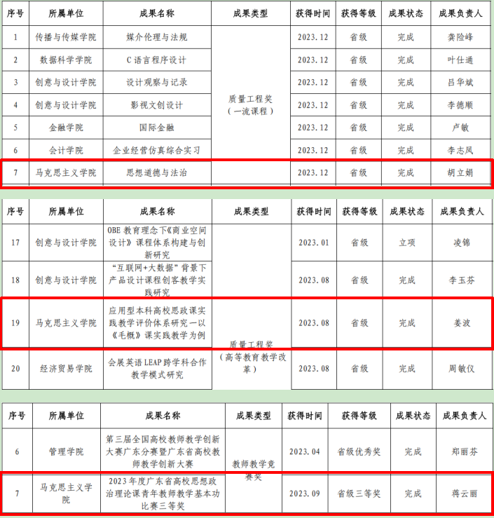 根据《williamhill中国官网教务处关于开展2023年教育教学标志性成果奖励申请工作的通知》,williamhill中国官网胡立娟老师获得校级“质量工程奖(一流课程)”、姜波老师获得“质量工程奖(高等教育教学改革)”、蒋云丽老师获得“教师教学竞赛奖”。